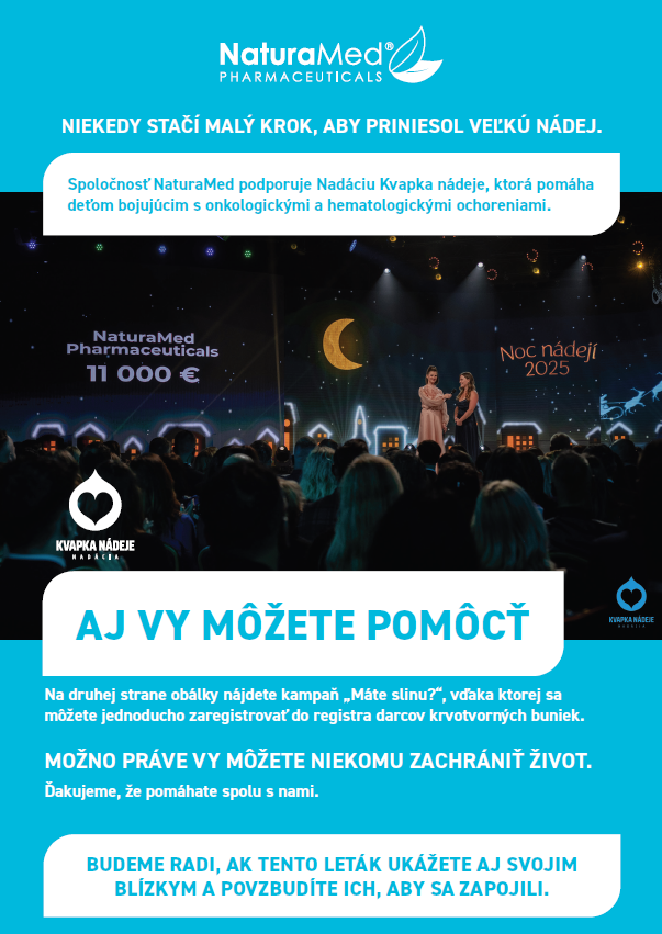 V spoločnosti NaturaMed si túto myšlienku dlhodobo uvedomujeme. Aj preto podporujeme Nadáciu Kvapka nádeje, ktorá pomáha deťom bojujúcim s onkologickými a hematologickými ochoreniami. Spolupráca s nadáciou je pre nás prirodzenou súčasťou našich aktivít v oblasti pomoci, pretože veríme, že pomoc má zmysel.